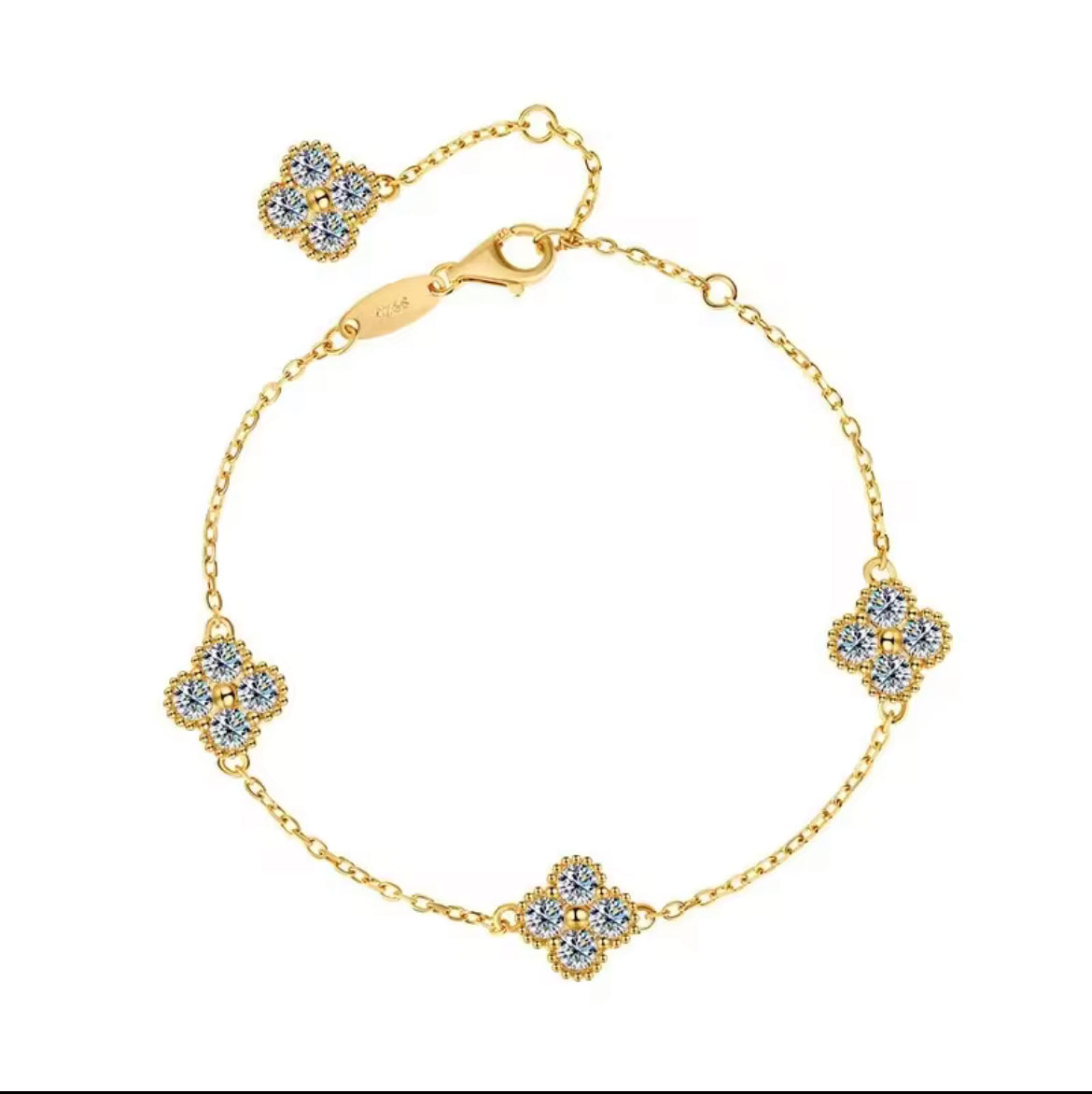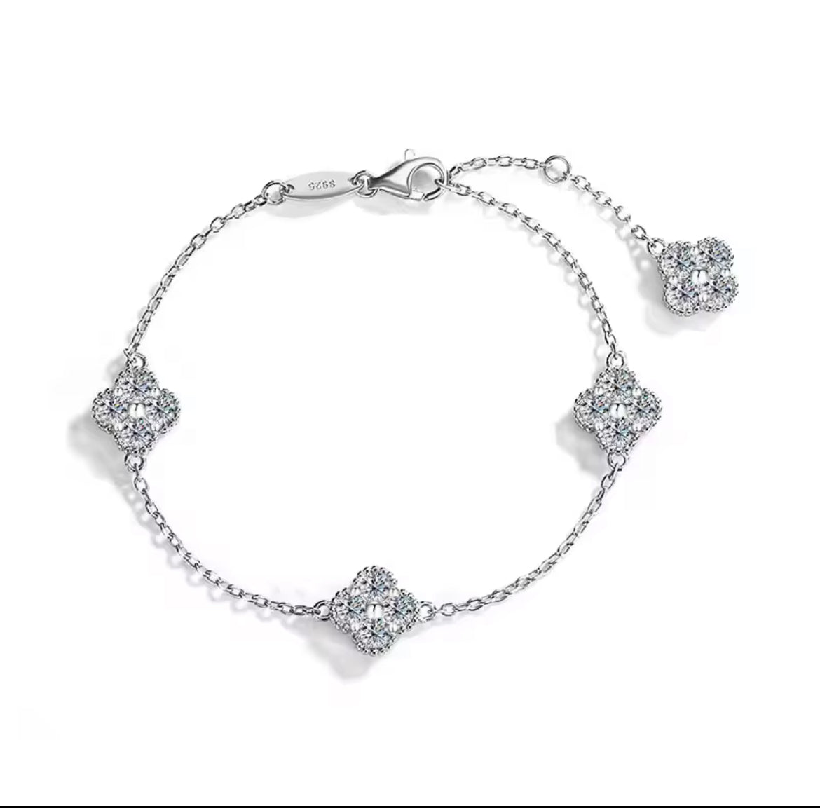 Delicately linked, this bracelet features a single moissanite clover at its center — a minimal yet sparkling piece perfect for stacking or wearing solo.
