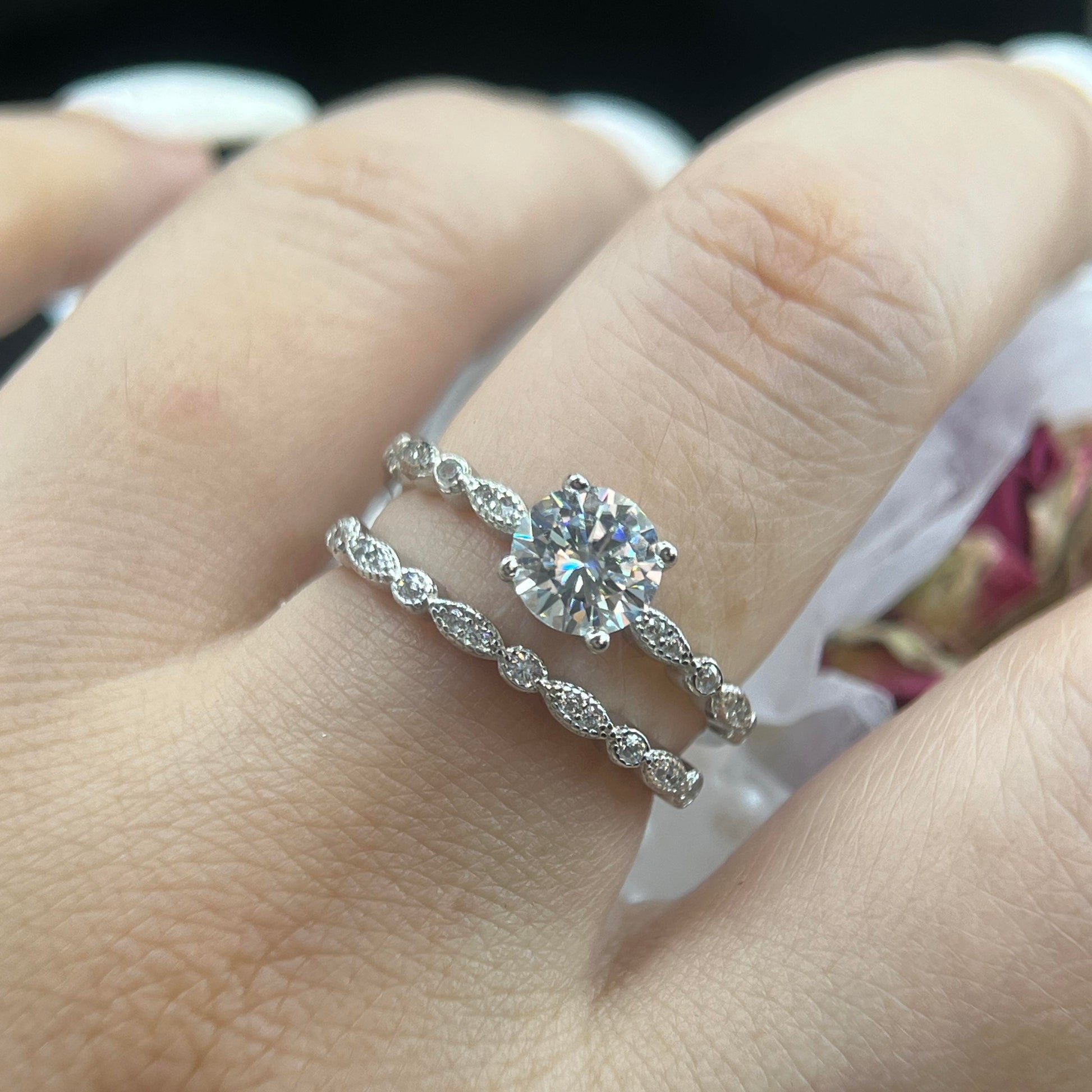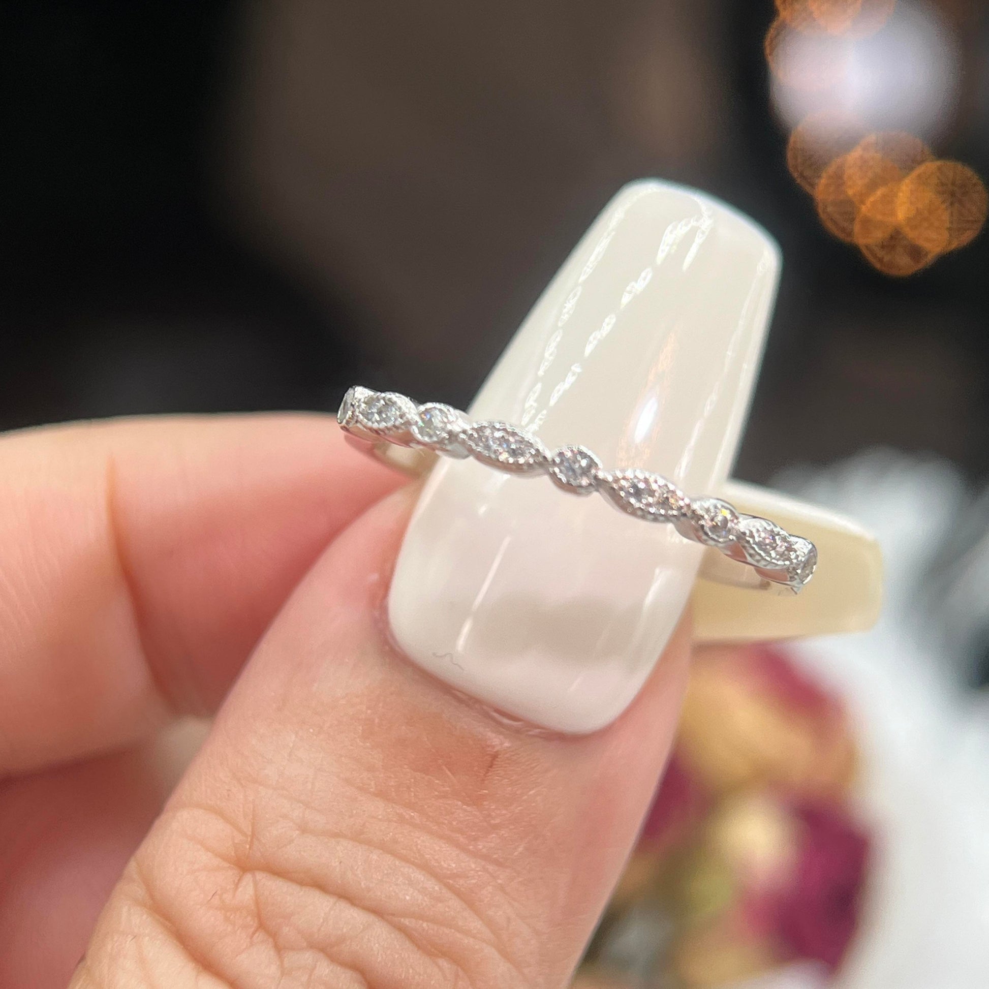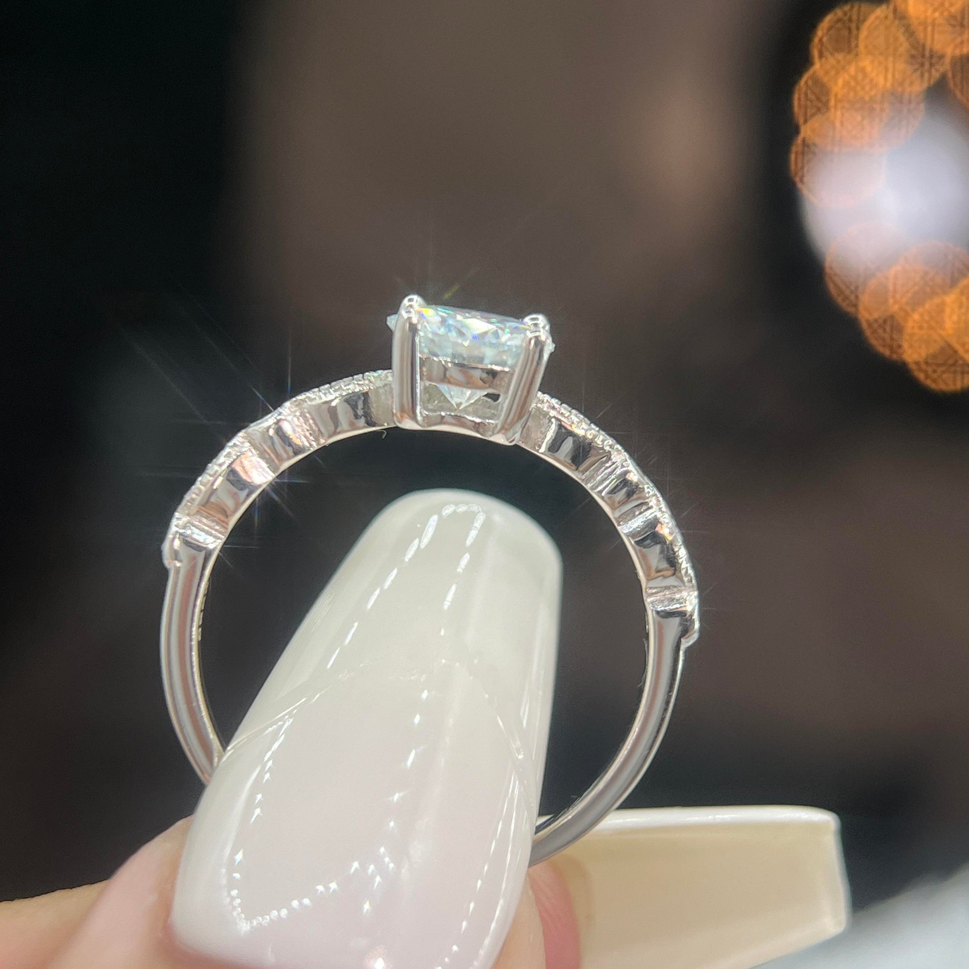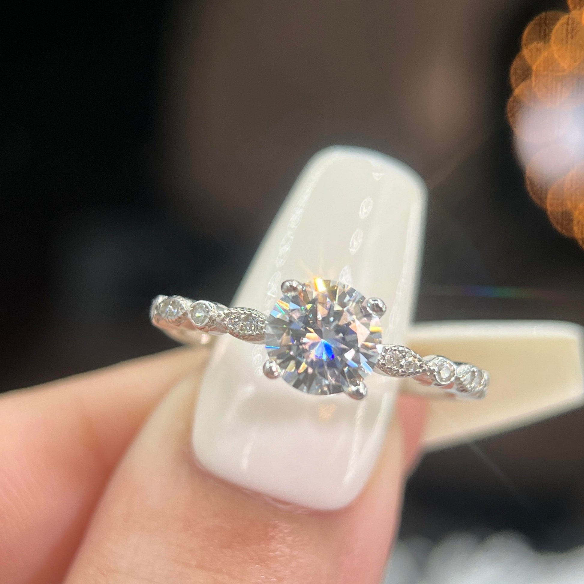 Design: A unique and regal vintage-inspired band that features a stunning scalloped pavé setting. Each delicate scallop is meticulously set with a small, brilliant moissanite, creating a continuous halo of light that enhances the central stone's brilliance. The intricate, crown-like detailing gives the ring a truly bespoke and luxurious feel.